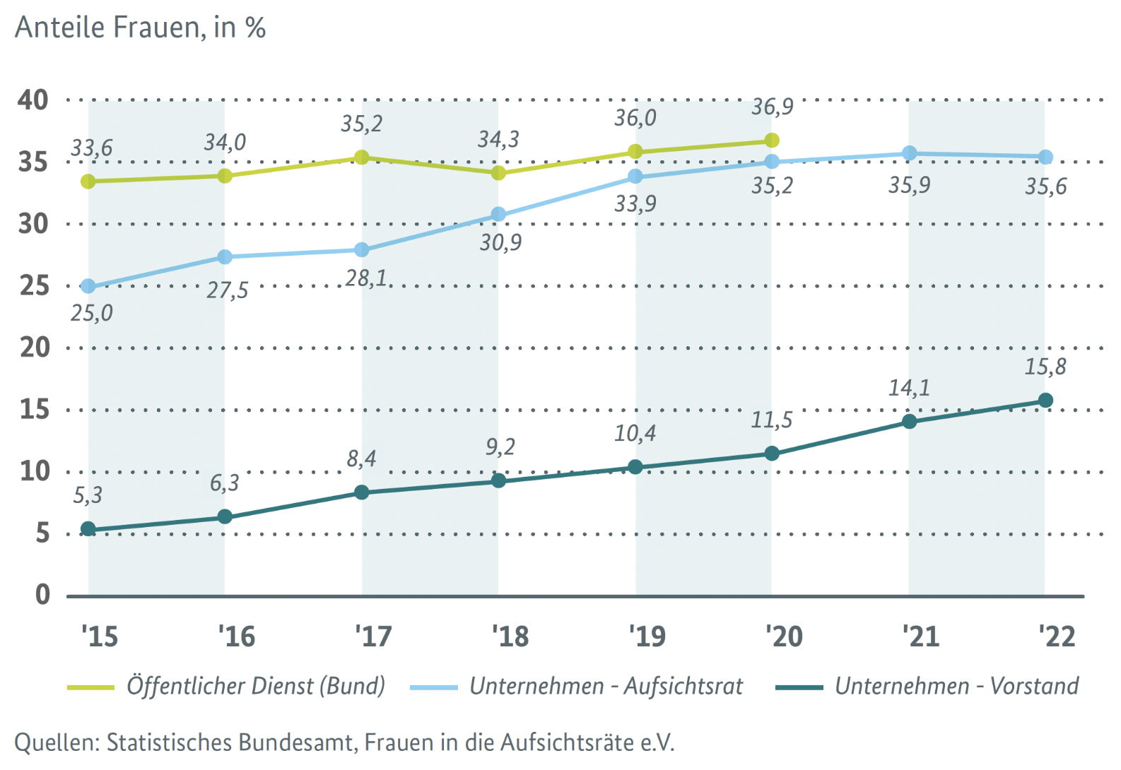Deutschland hat in den letzten Jahren regulierend eingegriffen. Durch das Erstes Führungspositionen-Gesetz (FüPoG I) wurden für börsennotierte Unternehmen Mindestquoten in Aufsichtsräten eingeführt. Dennoch ist der Anteil von Frauen auf Vorstandsebene vergleichsweise gering. In vielen großen Unternehmen bewegen sich die Vorstände weiterhin unter 20% Frauenanteil.